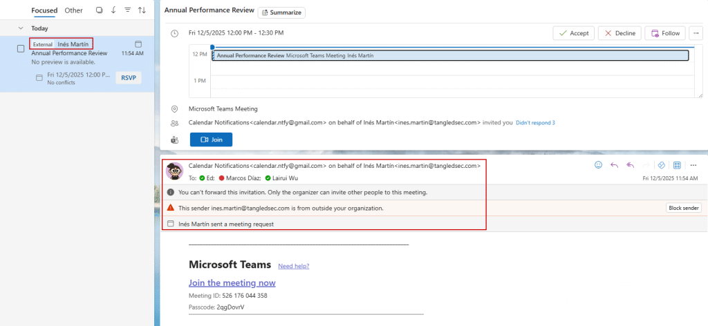 There is a feature enabled by default in Microsoft Outlook that automatically processes meeting requests, allowing the integration between Outlook and Microsoft Teams event workflows. By replicating the structure of these legitimate calendar events, an attacker can send a compliant RFC email that gets automatically processed and added to the victim’s Outlook calendar, regardless of whether they accept the meeting. Furthermore, the event will persist in the user’s calendar even if the originating email is deleted.
