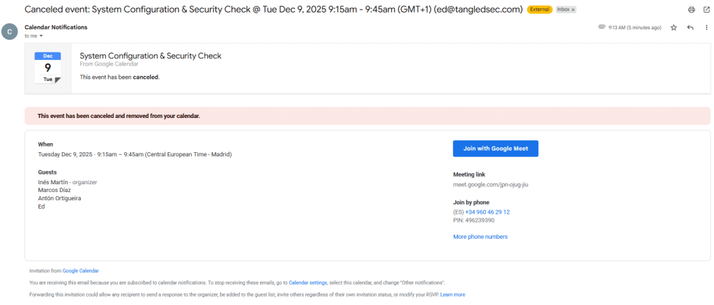 Again, it’s time for a demo. A malicious meeting will be sent from a personal mail account spoofing ines.martin@tangledsec.com. When the user (Ed) tries to join the meeting, he will be redirected to a malicious website that replicates Google Meet and will require to download some kind of malware. After completing the required steps, he will access a fake meeting website, where he will wait for the other participants to join the meeting. However, after a while, he will get an email cancelling the meeting.