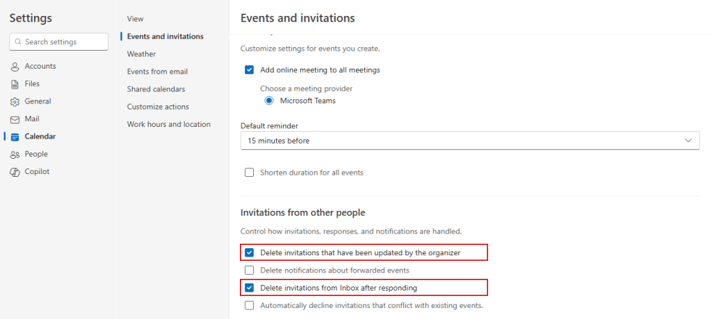 - Individually: Select General > Event settings > Add invitations to my calendar: “When I respond to the invitation in email”. 5