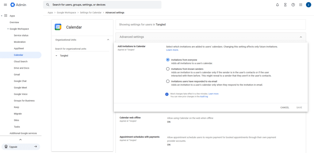 - Globally: To set the setting for all users in the directory, navigate to the Google Admin console > Apps > Calendar > Advanced settings and click “Add invitations to Calendar” to set the desired option.