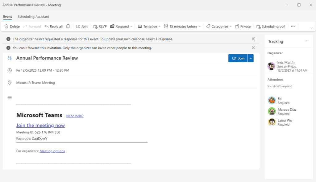Note that an “on behalf of” tag next to the original sender is added, as well as a warning banner stating that the organizer mail is from outside the organization (clearly not the intended behavior).