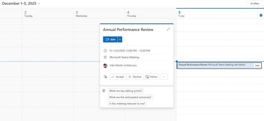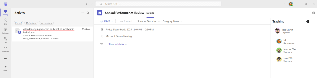 If we have Microsoft Teams connected, we will also get a notification about the event, just like it would regularly happen with a legitimate meeting. On the left panel the original sender will appear, however, the calendar section looks similar to the one in Outlook.