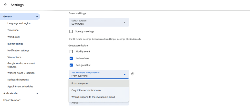 There are three possible options: add invitations to my calendar from everyone, only if the sender is known, or only when responding to the invitation in email.