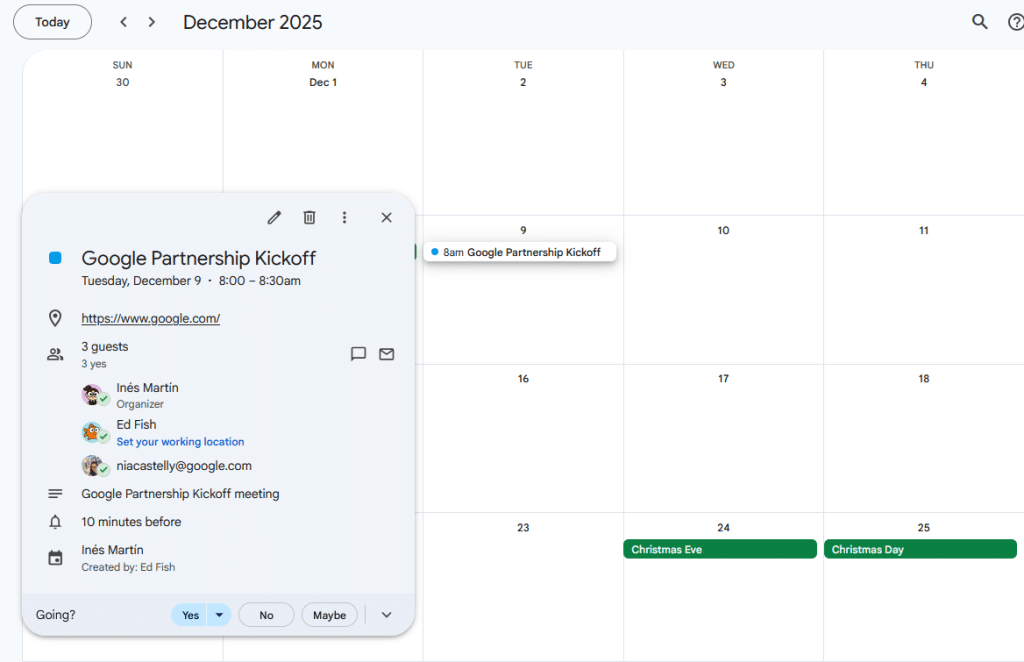 Another interesting detail is that it is possible to manipulate the event status so that it appears already accepted by the organizer, attendees, and even the recipient themselves. By combining these details with the appearance of legitimate Google Calendar mail invitations, it is possible to craft highly realistic phishing invitations.