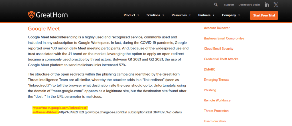 Well, it would, unless the URL allowed other paths deviating from the standard format and Google Meet’s domain itself had an Open Redirect vulnerability. A brief investigation quickly revealed that meet.google.com does, in fact, contain a known Open Redirect vulnerability.