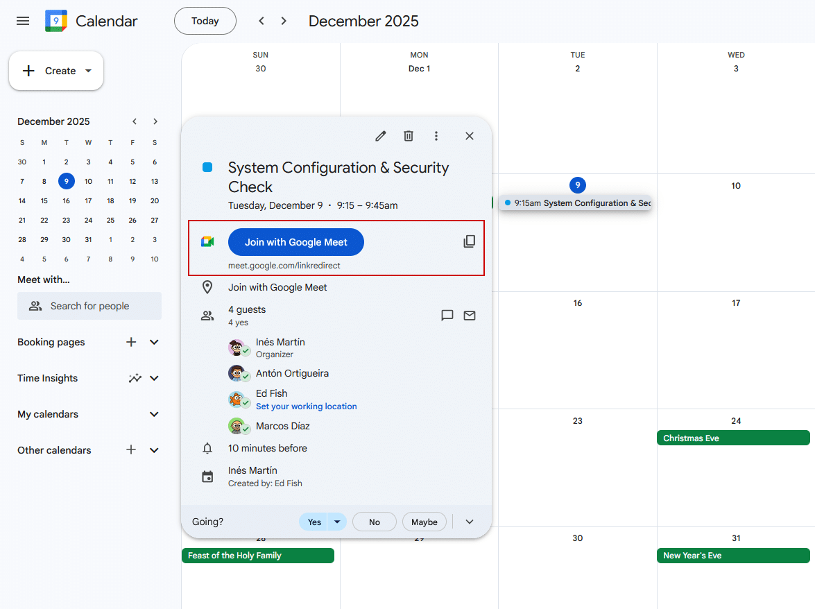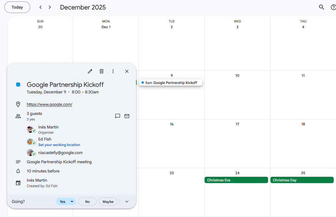 Another interesting detail is that it is possible to manipulate the event status so that it appears already accepted by the organizer, attendees, and even the recipient themselves. By combining these details with the appearance of legitimate Google Calendar mail invitations, it is possible to craft highly realistic phishing invitations.