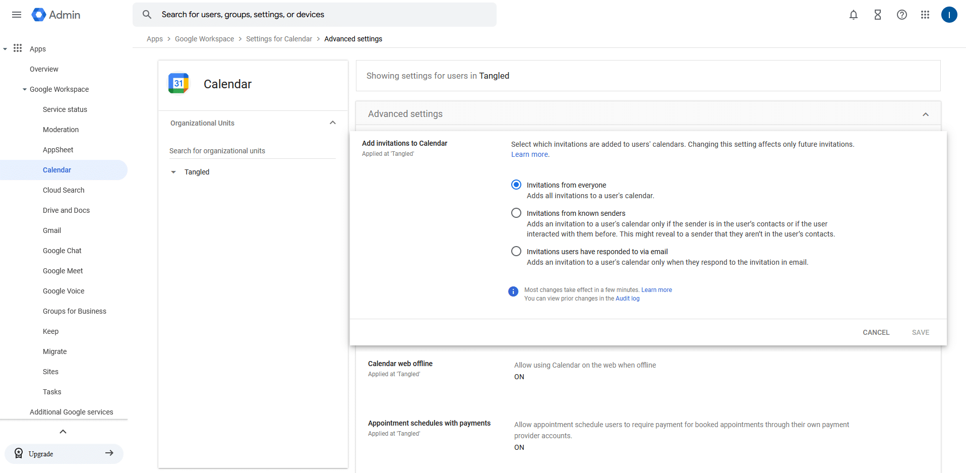 - Globally: To set the setting for all users in the directory, navigate to the Google Admin console > Apps > Calendar > Advanced settings and click “Add invitations to Calendar” to set the desired option.