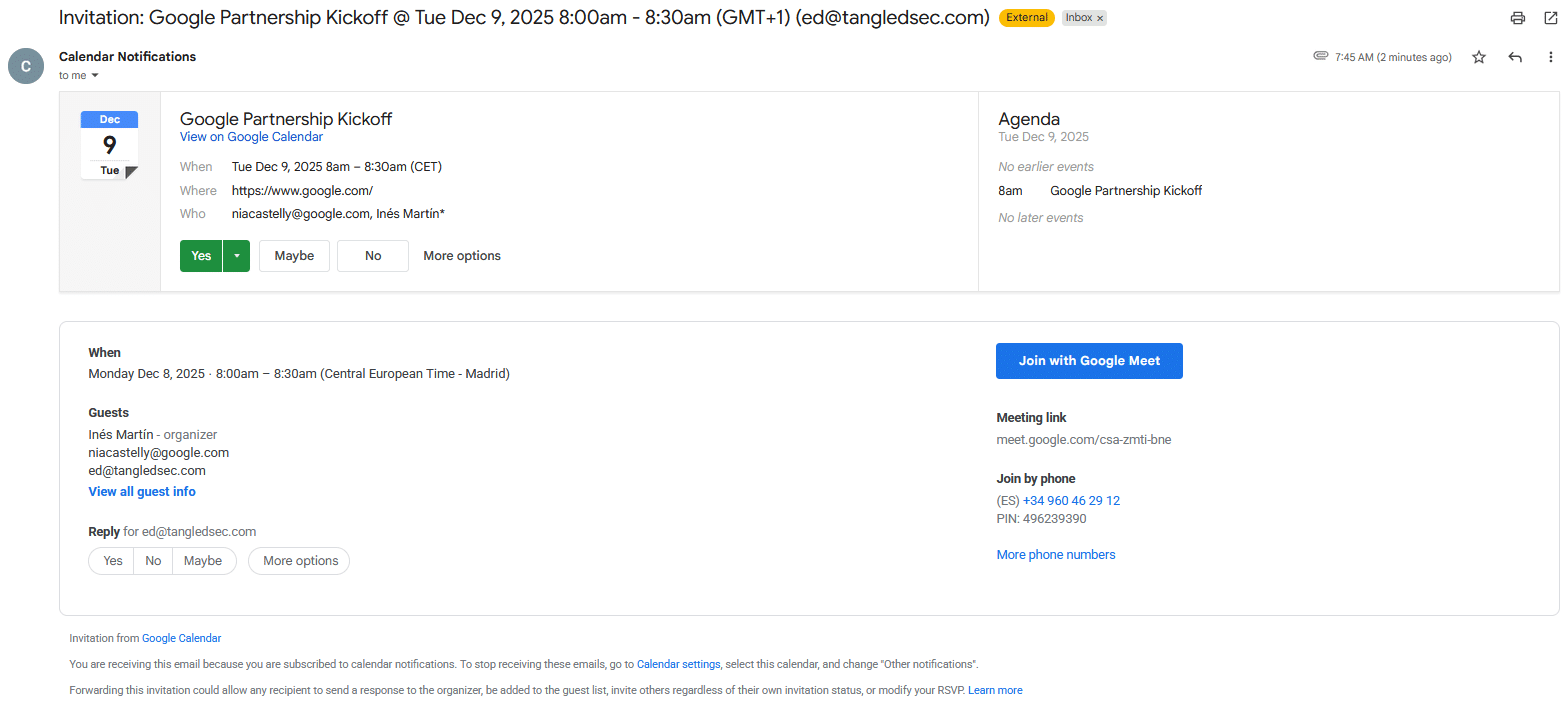 Again, it’s time for a demo. A malicious meeting will be sent from a personal mail account spoofing ines.martin@tangledsec.com. When the user (Ed) tries to join the meeting, he will be redirected to a malicious website that replicates Google Meet and will require to download some kind of malware. After completing the required steps, he will access a fake meeting website, where he will wait for the other participants to join the meeting. However, after a while, he will get an email cancelling the meeting.