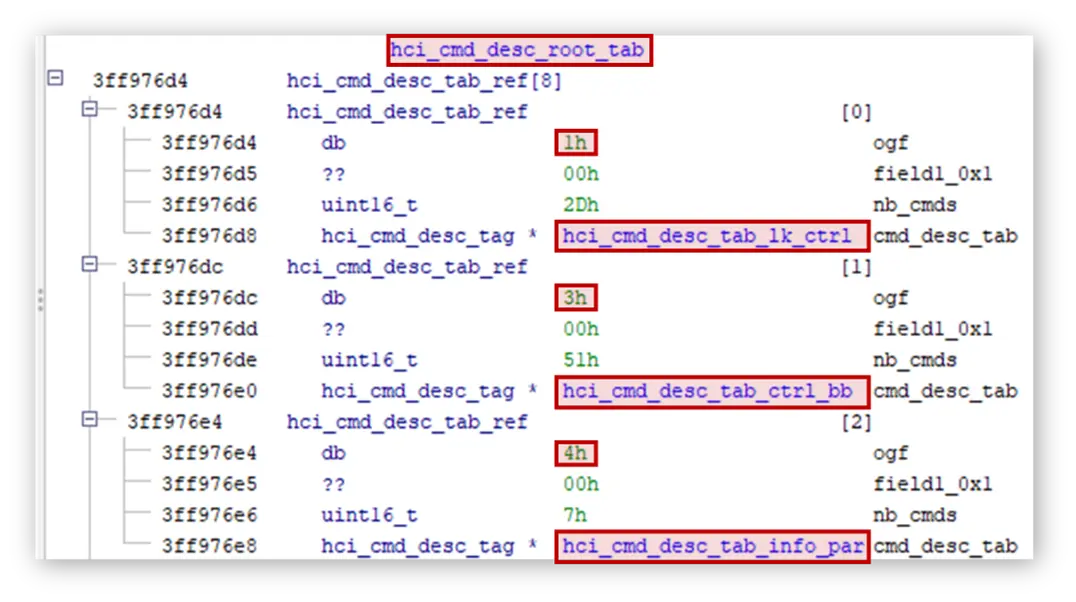 Examining the ‘H4 INIT’ function in detail, it sets a couple of callbacks that are executed when HCI packets are received. By analyzing the callbacks, we identified a function that queries a memory table to determine what should be executed for each HCI packet.
