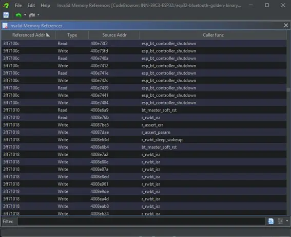 The plugin simply lists where in the program there are pieces of code that try to access memory that has not yet been recognized and labeled. Using the resulting table, we can easily locate functions that have Bluetooth related names trying to access memory located at 0x3ff71000!