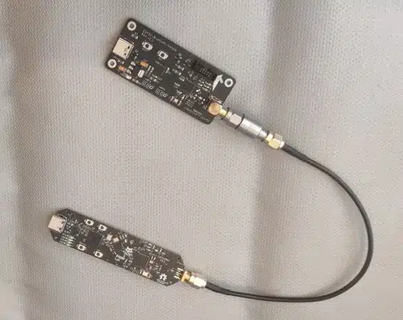 Figure 5. Custom ESP32 board connected to an ElectronicCats CatSniffer for testing.