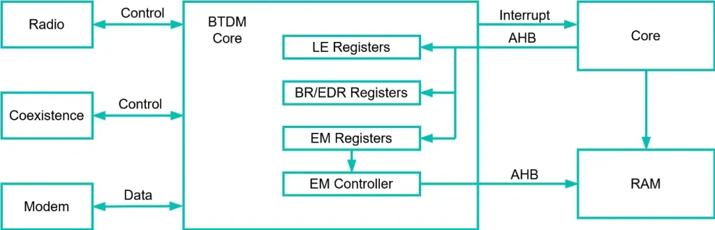 - Exchange Memory that is a portion of the general-purpose RAM that the BTDM and the main core share. This allows the BTDM Core to access general RAM in the same way as the main processor core can. The exchange memory will be used as the main Bluetooth information exchange mechanism.