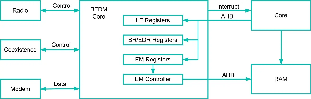 - Exchange Memory that is a portion of the general-purpose RAM that the BTDM and the main core share. This allows the BTDM Core to access general RAM in the same way as the main processor core can. The exchange memory will be used as the main Bluetooth information exchange mechanism.