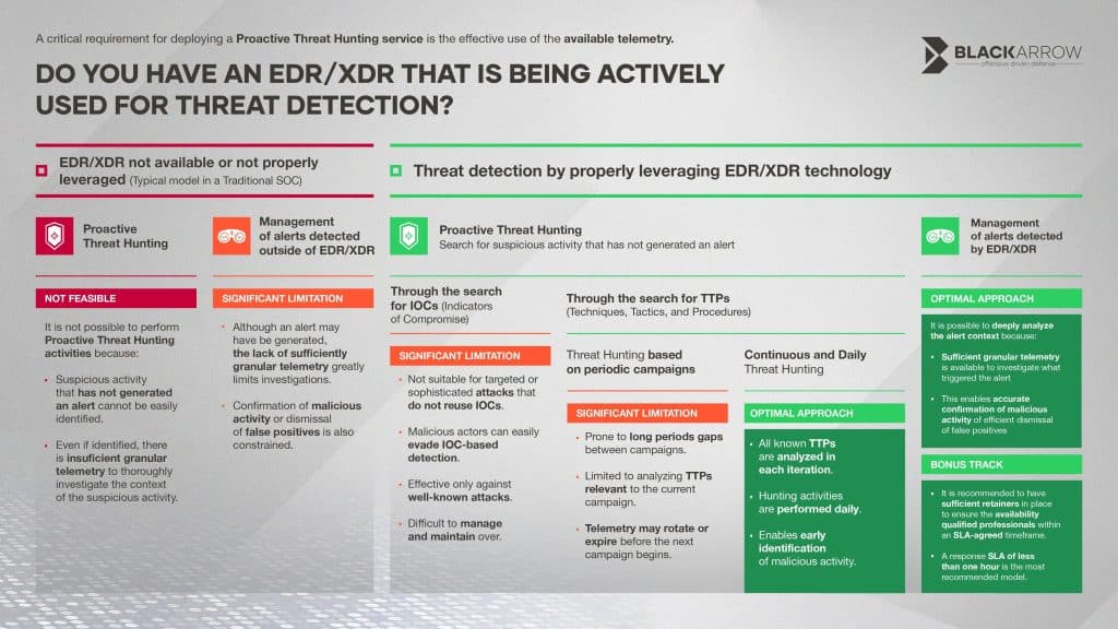 The infographic presents the alternatives, capabilities, and limitations of the main threat detection models, identifying which ones can truly be considered “Proactive Threat Hunting” — the optimal approach.