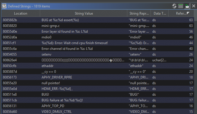 To confirm that 0x80800000 is the correct loading address, the binary is loaded at that address and a look at the strings in Ghidra reveal that almost all of them have references. This is probably right then.