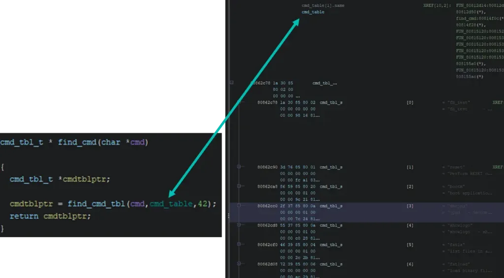 Finally, the run_command function leads us to the U-Boot command table.