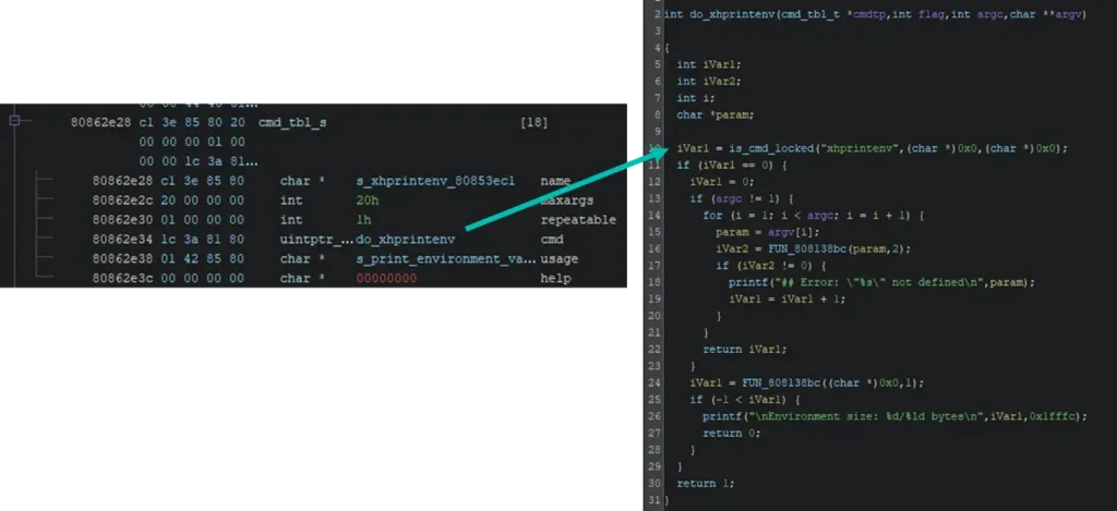 Now that the command table is humanly readable, it is possible to look at the implementation of one of the previously locked commands such as xhprintenv.