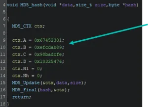 Particularly, the plugin looks for common cryptographic constants and tags them. Thanks to that we can identify the MD5 hashing function.