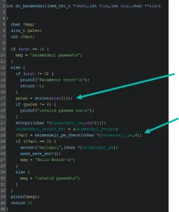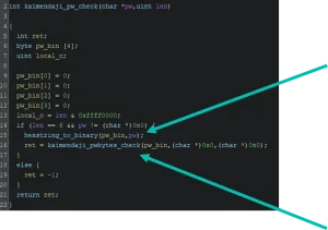 With this information fed into Ghidra, we now can look at the kaimendaji command with a little bit more context. The command checks that a parameter is passed. This parameter is the password and should be 6 characters in length. If the conditions are met, a password checking function is called.