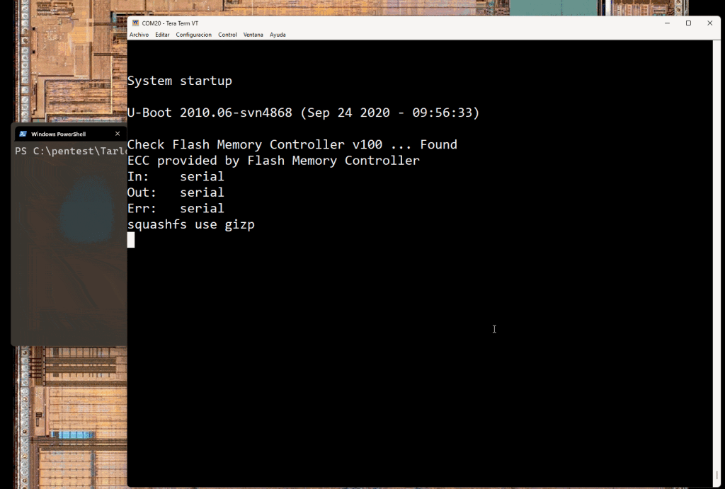 Fortunately, the U-Boot bootloader seems to be configured to allow for boot interruption. After some manual guesses, no shell came out, so a decision to automate the break character search was made…