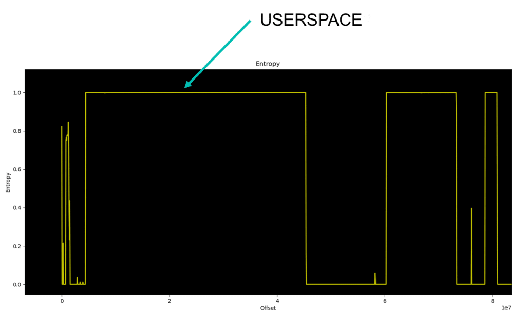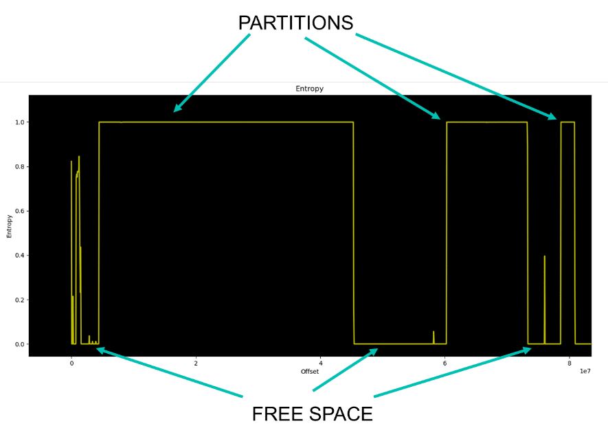 Another tool can provide relevant information to deal with this memory dump. Entropy of the file can be plotted to identify where the density of information is, leading us to identify partitions and the free space between them…
