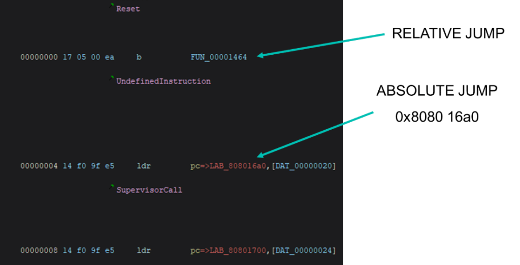 The first instructions we find at the beginning of the bootloader is an IVT (Interrupt Vector Table). This table points to different functions that handle exceptions and other events. Particularly, the first one contains a relative jump and does not provide much information regarding loading address, but the second one, is an absolute jump and contains an absolute address reference. Because bootloaders are usually loaded into aligned addresses, rounding this address gives us a promising loading address at 0x80800000.