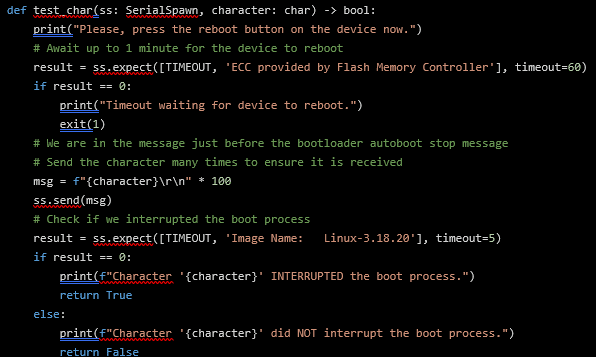 The above Python function uses the pexpect-serialspawn to wait for text indicating that the device has just started booting. Whenever this text is found, it proceeds to send 100 characters to ensure not to miss the bootloader countdown, and finally, text is checked for known strings that occur during the normal boot process. The last check enables the detection of whether the device booted or if it was interrupted.