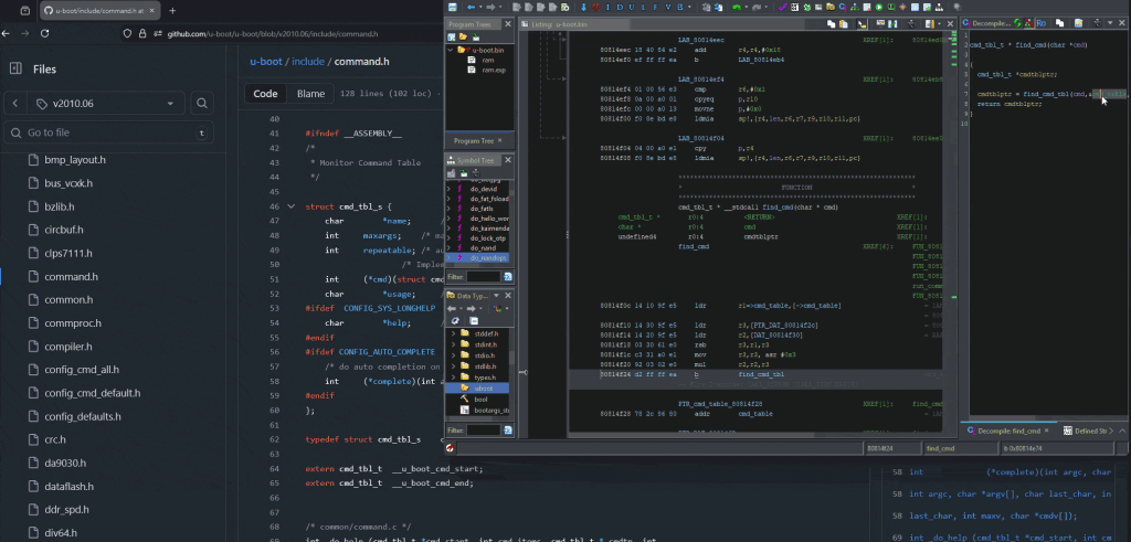 Now that the binary is ready to be analyzed, using the information seen during the boot process, the original U-Boot source code can be located here.