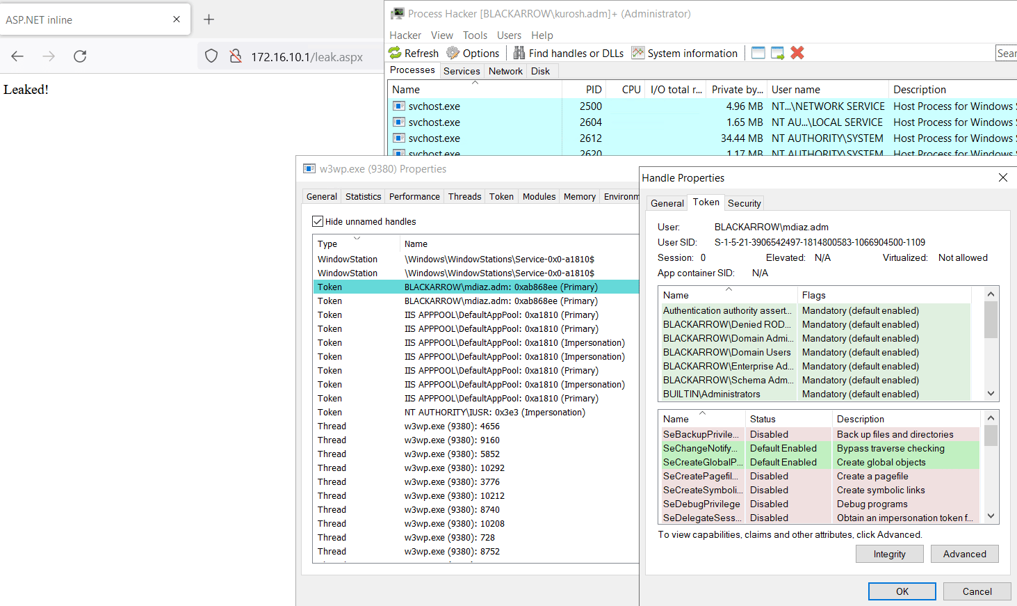 This way, we obtain a web shell that allows us to abuse the leakage of token handles to escape the restrictions of the Application Pool Identity security context.