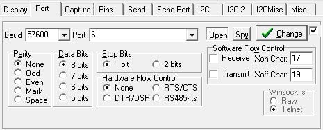 En Realterm se configuró como se puede ver en la captura el interfaz USB / UART-TTL.